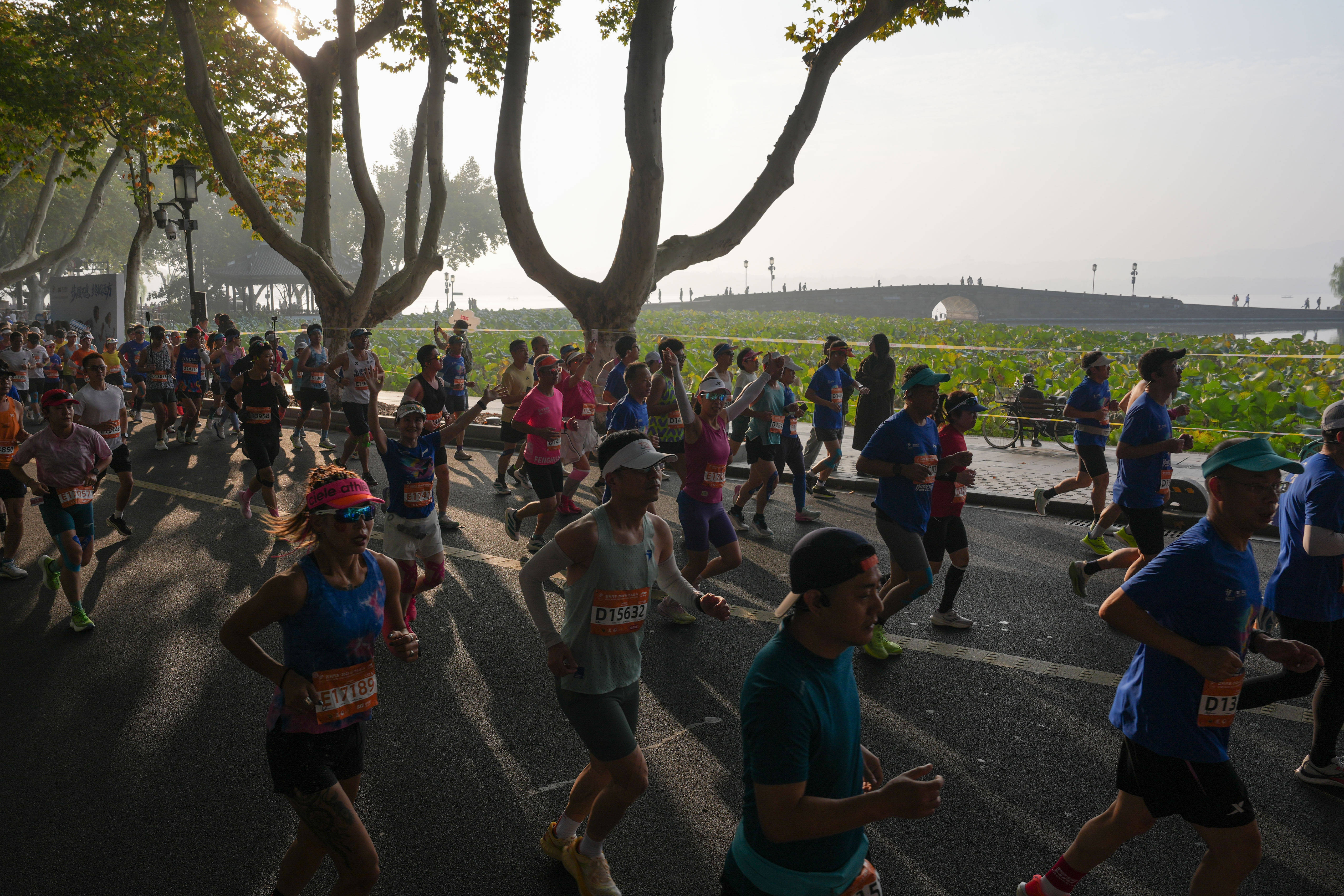 11月2日,参赛选手在比赛中经过西湖景区断桥附近。 新华社记者 黄宗治 摄