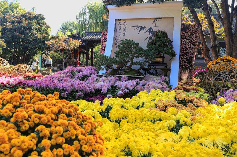 11月10日,人们在江苏扬州个园景区“菊隐个园,四时闲趣”为主题的精品菊展上赏菊游玩。新华社发(齐立广摄)