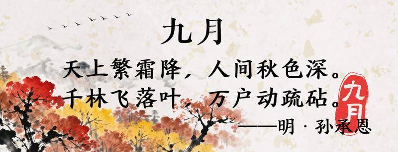 农历九月正值深秋时节,草木变了颜色,大自然把最绚烂的色彩留给了这个季节。略带寒意的秋风中,飞舞的各色落叶是此时最浪漫的景致。明朝孙承恩在《九月》一诗中,用“天上繁霜降,人间秋色深”点明此时季节特点。