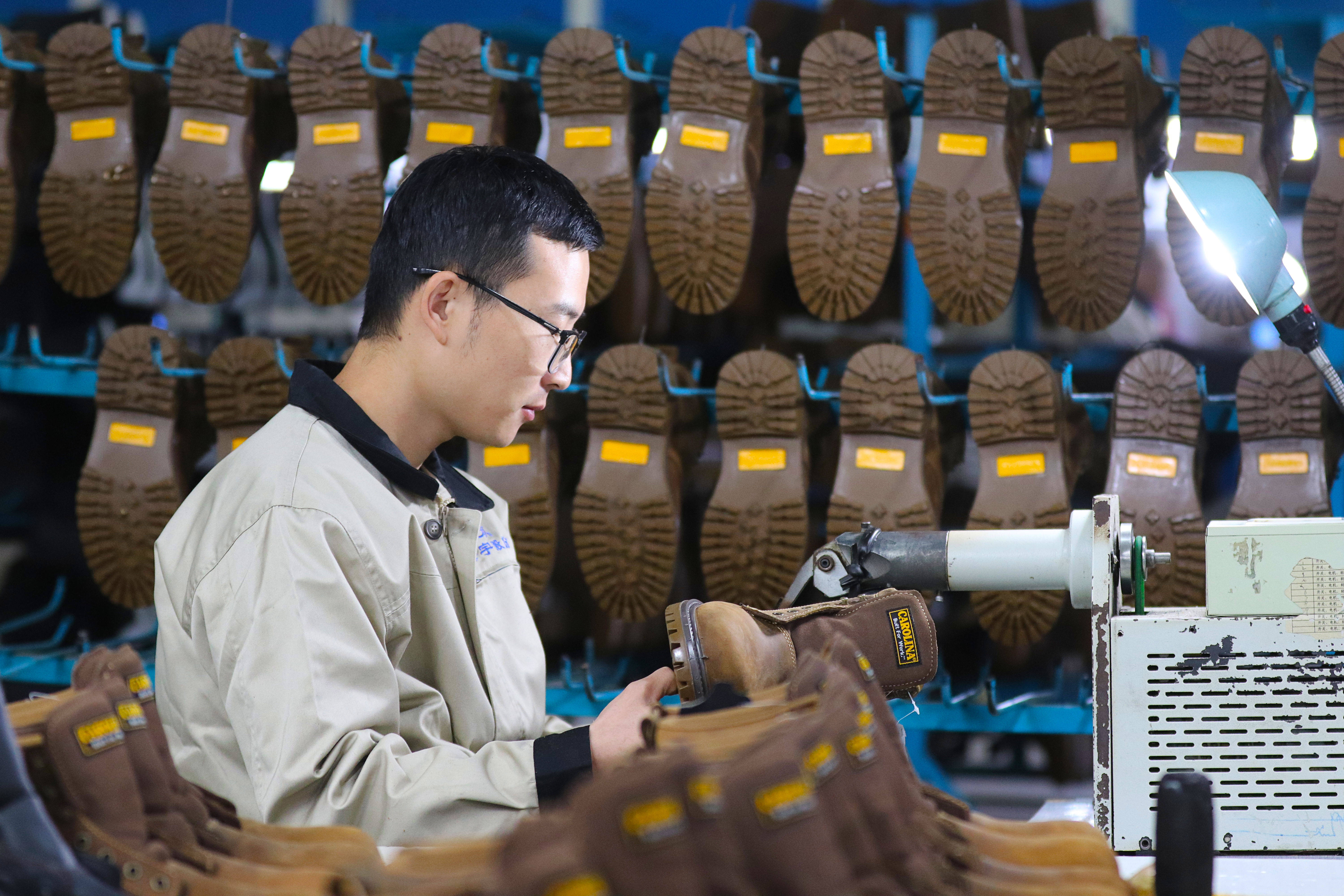 10月20日,工人在山东省高密市海宇股份有限公司加工安防鞋。 新华社发(李海涛摄)