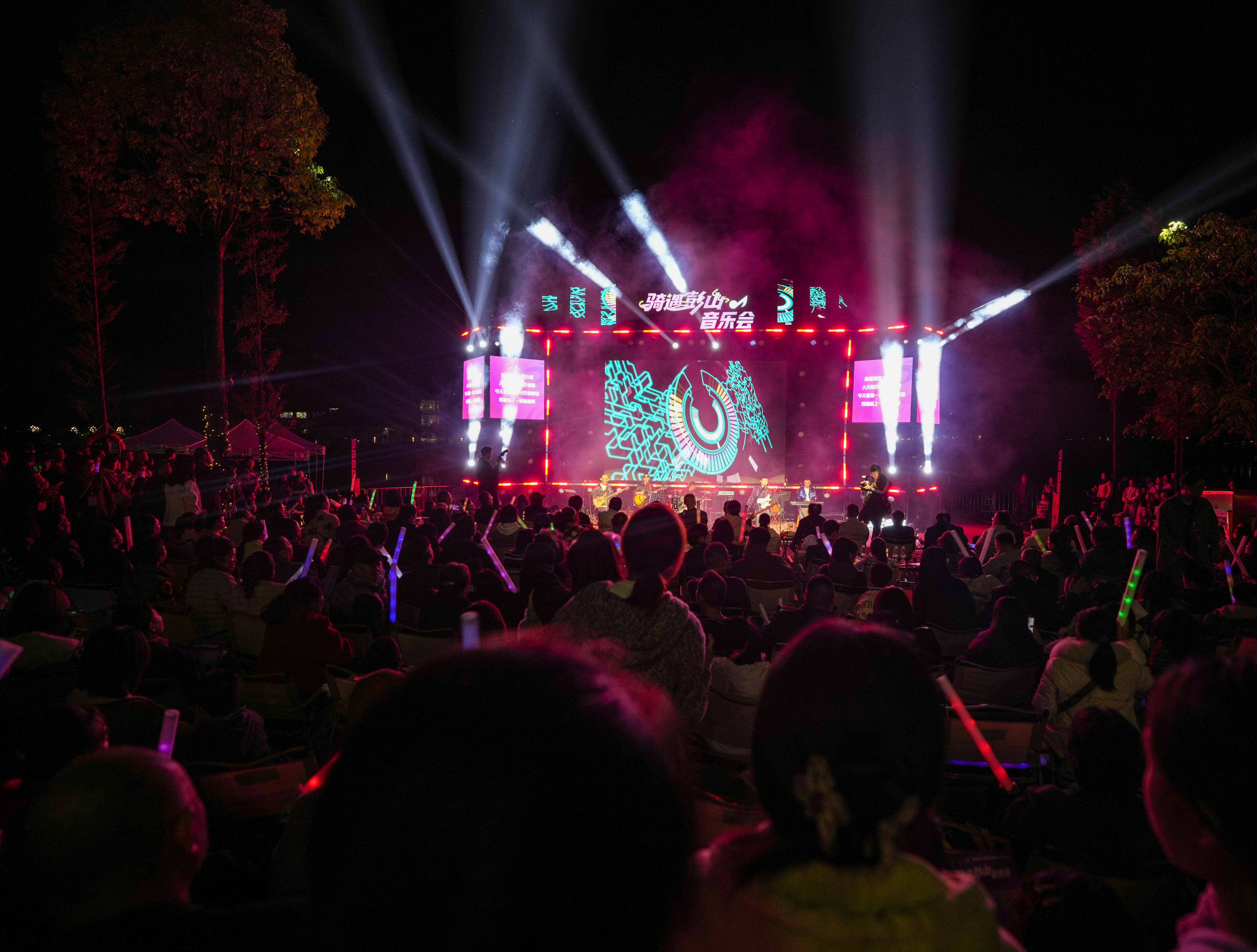 11月1日晚,2025中国公路自行车公开赛(眉山彭山站)开赛前夜,一场无人机表演点亮四川省眉山市彭山区的夜空,当地群众在非遗市集和主题音乐会等多元文化活动中享受惬意的周末时光。 近年来,四川省眉山市彭山区积极推进文体旅融合发展,借助赛事开展一系列配套文化惠民活动,实现“一场赛事,多重体验”的综合经济社会效益。