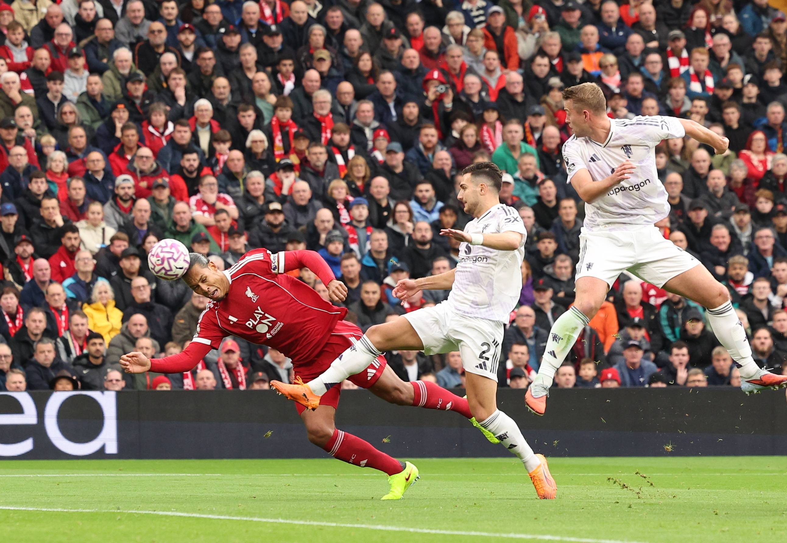 10月19日,曼彻斯特联队球员达洛特(中)与利物浦队球员范戴克(左)拼抢。 新华社/欧新