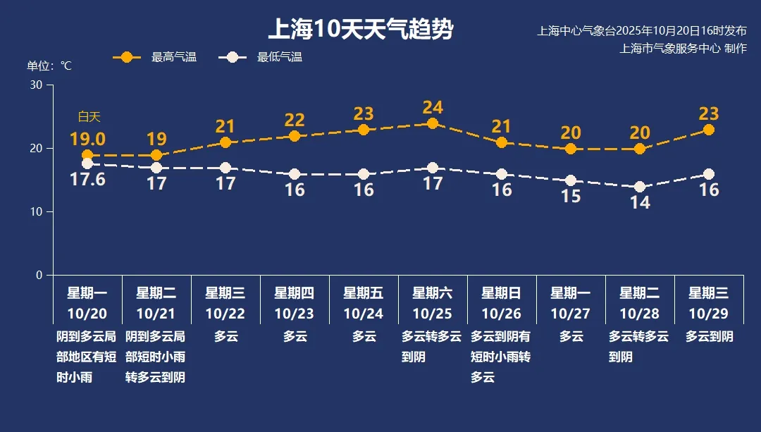 周三起,上海的天空状况转好;周四前后风力减弱,申城将迎来一段秋高气爽的天气。最高气温逐日回升,周六最高气温在24℃左右。早晚气温依旧较低,昼夜温差拉大,建议大家使用洋葱式穿衣法。周日前后受弱冷空气影响,气温略有下降并伴有弱降水。
