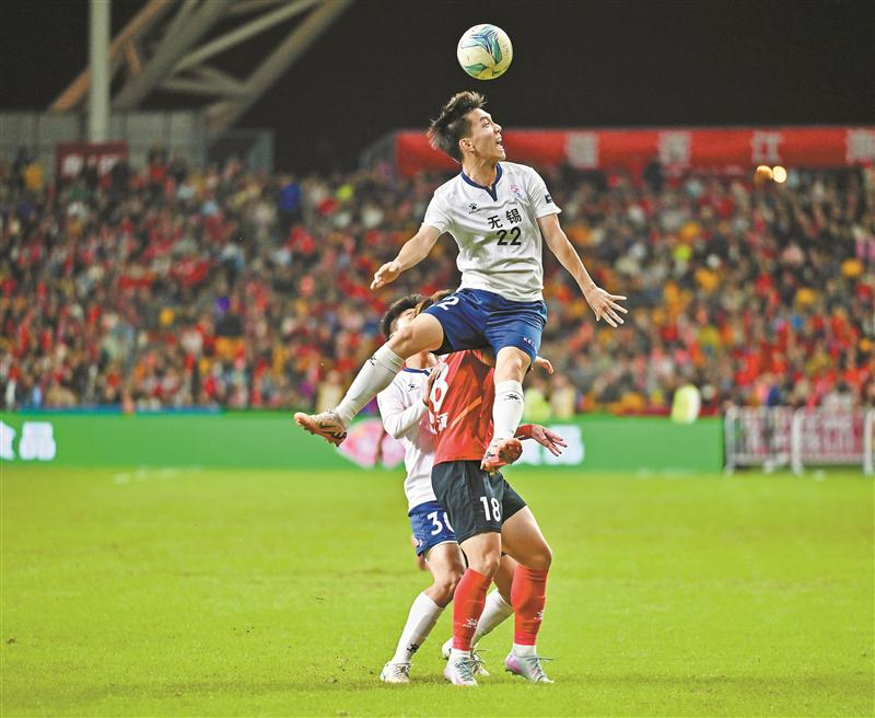 比赛开始后,两队在中场展开激烈争夺。南通队通过“抢逼围”获得更多球权,然后快速推进寻觅破门机会。老辣的唐京此役为无锡队变阵,由24号邓建飞出任单前锋,林子强、蒋孟泽和丁文韬在身后策应,然后由同乐和吴磊调度指挥,后防线则由有一定空战能力的胡升嘉、梁金虎、夏锡成、康乐强负责。“4231”的阵型攻防兼备。