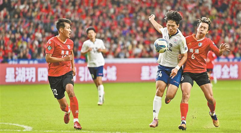 体能充沛的南通队防守强度不降,无锡队左、右两个边路的优势难以发挥。南通队换下黄蒋大亚,换上正牌前锋郭凯楠,强化地面进攻。双方陷入拉锯战。