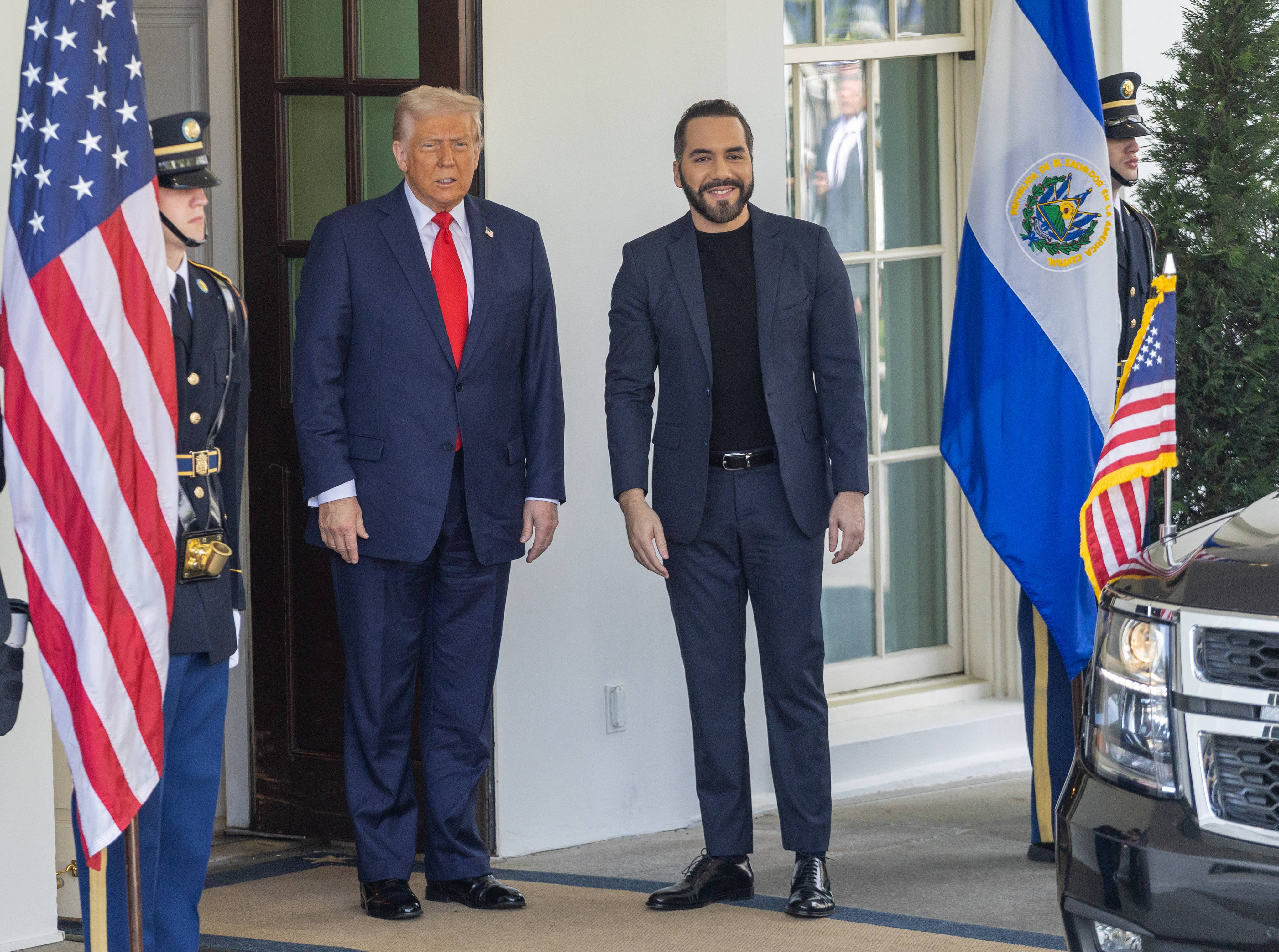 4月14日,美国总统特朗普在华盛顿白宫迎接到访的萨尔瓦多总统布克尔。特朗普当天在白宫会见布克尔时对记者说,伊朗正在拖延与美国的伊核问题谈判进程,可能面临美国的“严厉回应”。新华社记者胡友松摄
