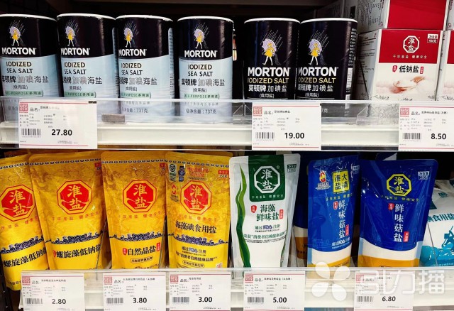 近日,在苏州奥体中心负一楼的一家超市,记者注意到售卖食用盐的货架被摆放得满满当当。货架的下层摆放着众多品牌的袋装食用盐,包括海藻精制加碘盐、纯精岩盐、天山湖盐、鲜味菇盐、自然晶盐、螺旋藻低钠盐等品种,每袋500克的售价在2.3至8元不等。而在货架的上层,则摆放了多款罐装及盒装盐。其中重量为737克的加碘海盐、普通加碘盐的价格分别为27.8元、19元,加碘海盐的瓶身显示,其源自于美国的百年品牌,由海水经阳光蒸发制成,拥有洁净的晶体盐粒,适合多种烹饪和烘焙方式。