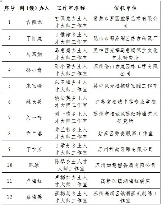 根据省人力资源社会保障厅《关于组织开展江苏省乡土人才大师工作室推荐申报工作的通知》(苏人社函〔2023〕7号)要求,经各县级市(区)组织申报推荐和初审,市级复核,拟提出吉佩龙乡土人才大师工作室等12家工作室列入候选推荐名单(名单附后,排名不分先后)。现予以公示:
