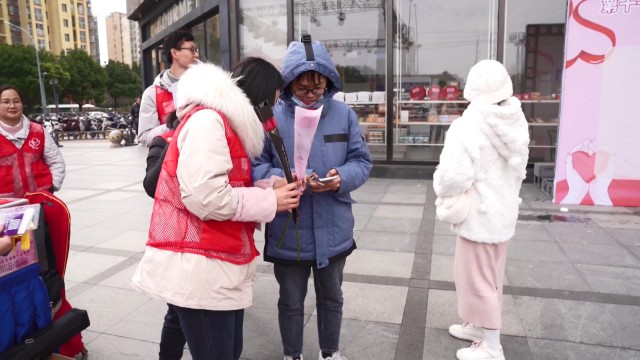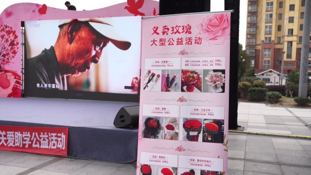在昆山青阳路一个广场上,周火生希望工程志愿者协会志愿者摆放了一束束玫瑰花,开展爱心助学、鲜花义卖活动。