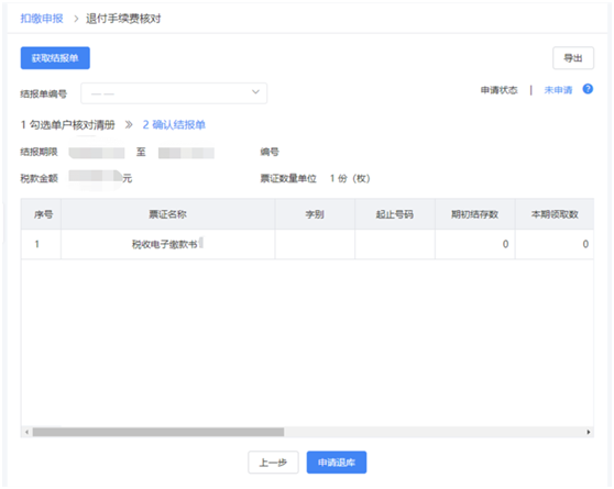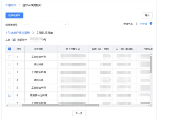 01、该年未申请过手续费退费的,在页面初始化查询到清册数据(也可点击【获取结报单】按钮手动重新获取数据)后,可以在【勾选单户核对清册】标签页勾选需要申请退费的实征税款记录,勾选完成后可点击【下一步】按钮或【确认结报单】按钮进入【确认结报单】标签页。