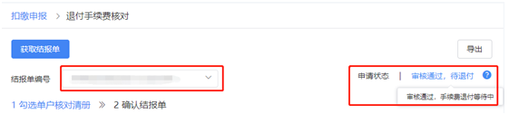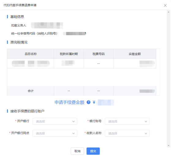 02、在“确认结报单”标签页核对数据完成后,点击【申请退库】按钮打开“代扣代缴手续费退费申请”弹窗,核对数据和手续费金额后,选择接收手续费的银行账户信息,最后点击【提交】按钮向局端发起手续费退费申请。