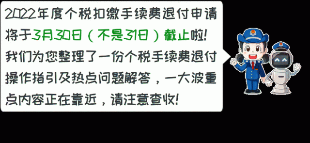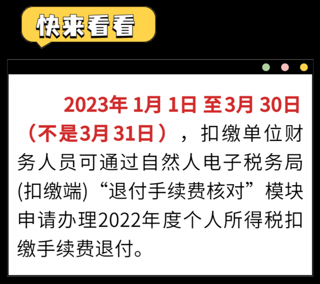 答:根据《财政部 税务总局 人民银行关于进一步加强代扣代收代征税款手续费管理的通知》(财行〔2019〕11号)规定,“三代”税款手续费按年据实清算。代扣、代收扣缴义务人和代征人应于每年3月30日前,向税务机关提交上一年度“三代”税款手续费申请相关资料。2023年1月1日-3月30日(不是3月31日)财务人员可通过自然人电子税务局(扣缴端)或自然人电子税务局(WEB端)“退付手续费核对”模块申请办理2022年度个人所得税扣缴手续费。注意:为确保您的合法权益,请务必在规定的时间内向税务机关提交退付申请。因扣缴义务人自身原因,未及时提交申请的,视为自动放弃 。