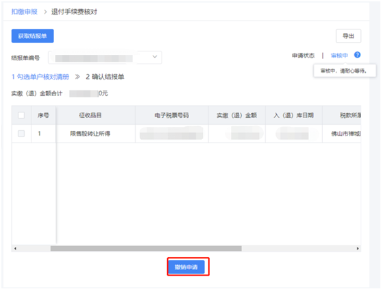 04、若已发起手续费退费申请但税务机关未进行退税终审时,需要发起撤销的,可点击【撤销申请】按钮进行撤销。