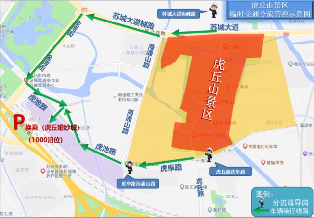 虎丘路虎阜路口:经虎阜路、虎池路引导至虎丘婚纱城换乘停车场。