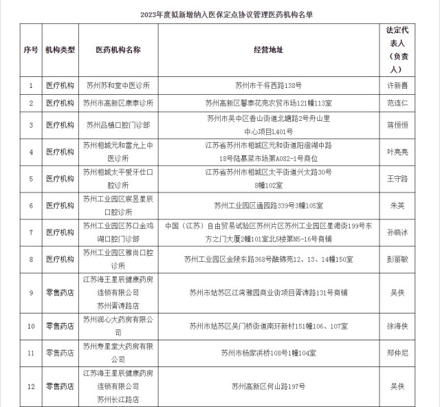 根据《苏州市医疗保障医药机构定点协议管理经办规程》(苏医基〔2022〕36号)规定,现对苏州苏和堂中医诊所等21家拟新增纳入医保定点协议管理的医药机构名单予以公示,公示期为2023年4月12日—2023年4月24日。