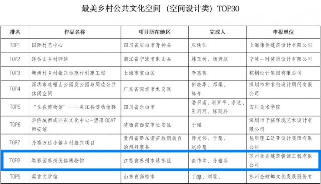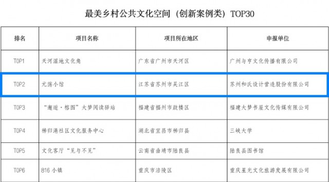 近日,文化和旅游部全国公共文化发展中心等单位联合主办的,2022年乡村公共文化空间设计展示活动,经组织专家组独立评审,苏州市共有五个地方入选,分别是,元荡小馆、肖家巷双创中心、树山音乐会客厅、苏州民俗博物馆、吴文化博物馆。