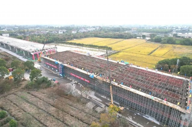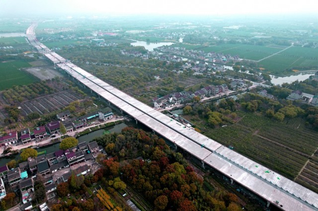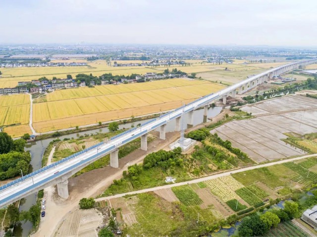 站在沪苏湖铁路的高架桥上向东望去,一道水泥长龙横卧元荡,蔚为壮观,肉眼可见的不远处就是上海青浦。这条于2020年开工建设,横跨三省市的沪苏湖铁路建设一直备受关注。铁路东起上海市,途经江苏省苏州市吴江区,沿太湖南岸西至浙江省湖州市,是连通上海、苏州、湖州等长三角重点城市的重要铁路运输通道。线路全长163.8公里,设计时速350公里,对于加快构建“轨道上的长三角”,支撑示范区高质量发展,促进长三角地区一体化发展具有重要意义。中铁十四局沪苏湖铁路项目部相关负责人介绍,目前苏州境内的工程进度按计划推进,线下工程已基本完成。2024年建成通车后,上海至湖州最快只要40分钟。