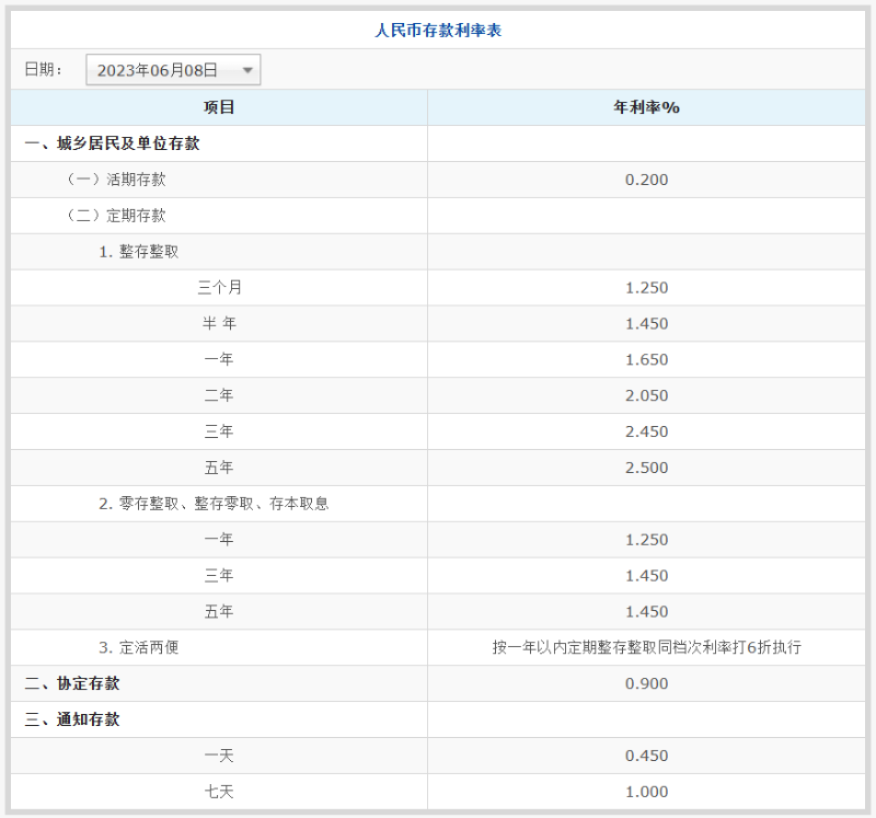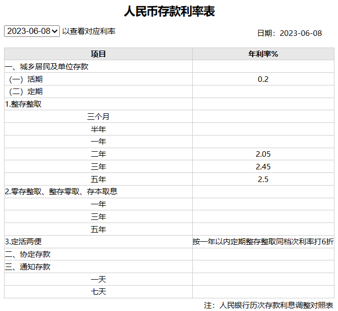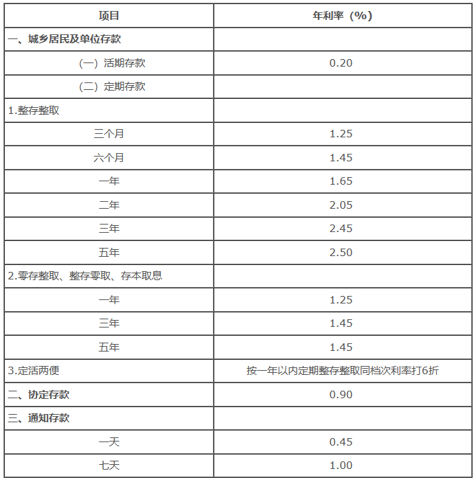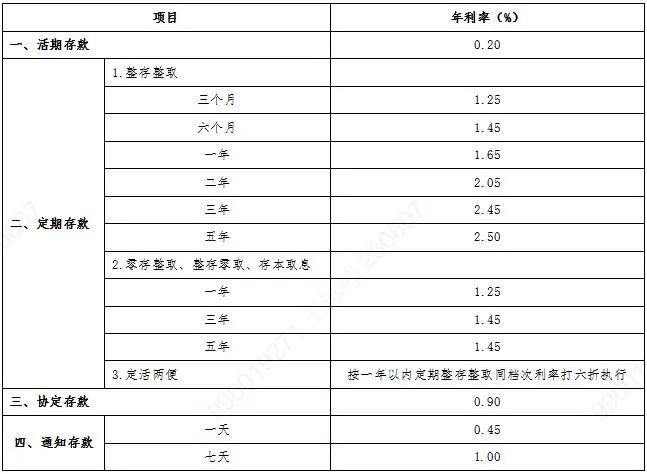 其中,活 期存款利率从此前的0.25%下调至0.2%。 2年期定期存款利率下调10个基点至2.05%,3年期定存利率下调15个基点至2.45%,5年定期存款利率下调15个基点至2.5%。