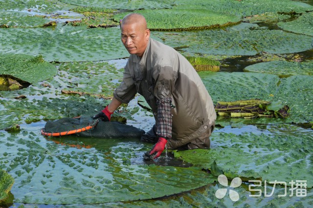种植户陆志华穿着厚厚的防水裤,戴着长袖手套,跋涉在水深没膝的田里,熟练地用特制竹刀将发黄的老叶划破,划出一条走道,弯腰用手在长满倒刺的叶片下摸出成熟果实苞,用竹刀割下、做上记号后一一装进网袋。