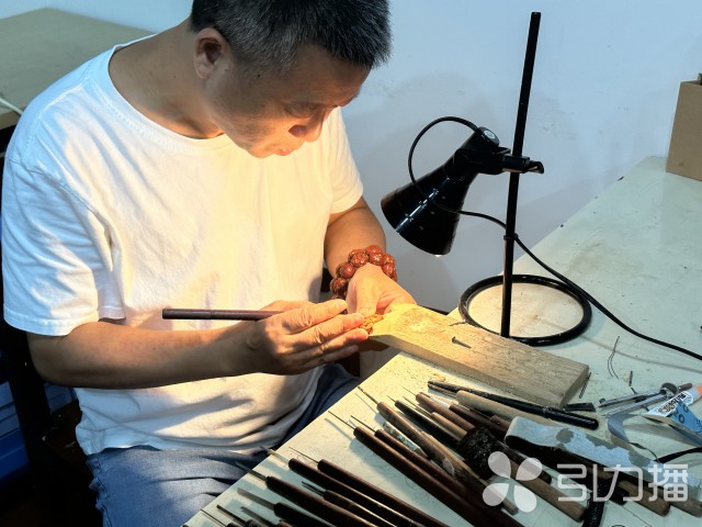 说这话的时候,殷毅军正就着灯光,坐在工作台边,一刀一划打磨着一颗未完成的作品,一个罗汉的形象隐隐浮现在仅一个指节大小的橄榄核上。他是工作台上,放着一块固定橄榄核的“牙砖”和几十把长长短短的刀具,除了一盏台灯,没有任何自动化的器械。殷毅军认为,守正应当是创新的前提,核雕的最精妙处在于纯手工的技艺,“熟悉的藏家一看到我的作品,就知道是我做的。”他说,手腕的用力方式、开相时的个人偏好、角色形象的刻画风格,都赋予了手工核雕作品不可替代的“灵气”,不能在创新中被丢弃。