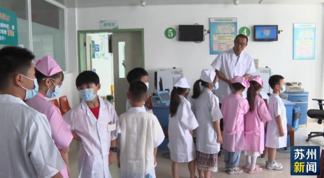 在吴中区金庭镇,暑托班的孩子们来到金庭镇中心卫生院进行暑期实践活动,并体验了一次“小医生”。