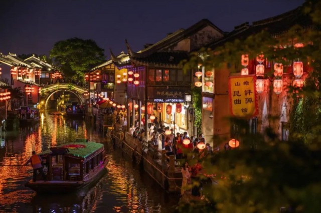待到夜幕降临,坐船夜游山塘,凭窗闲坐,穿桥而行,岸上游人如织,河畔灯火摇曳,别有一番江南情调。