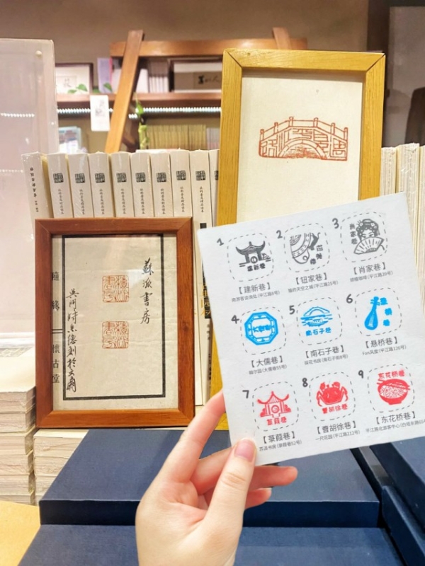 印章图案涵盖了街巷名称、昆曲、评弹、苏州美食、园林建筑等元素,每一枚都很精致哦~(“平江九巷”旅游纪念章免费,盖章纸可在猫的天空之城书店购买。)