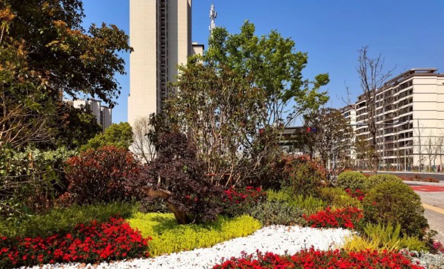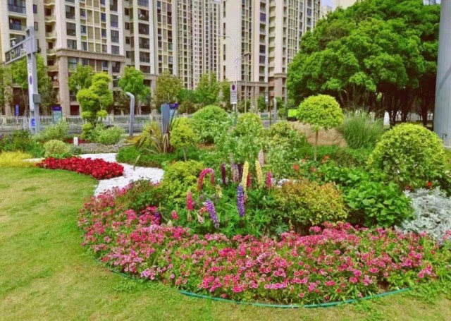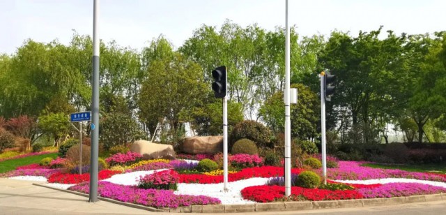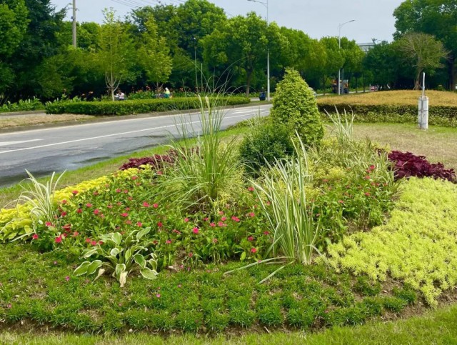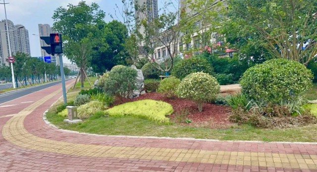 广济路与聚峰路路口,增加花镜组合,采用银姬小蜡球、龟甲冬青球、细叶芒、斑叶芒、佛甲草、红黄矾根、玉簪等,保证景观效果。