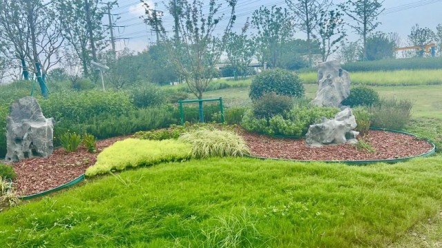 南天成路广济北路路口,将原地块进行地形梳理,结合原有苗木进行组团种植,将现场凌乱的景石与组团搭配组合,配以石子线条,结合地形形成“高山流水”的意境。