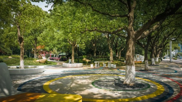 星都小游园,占地约7700m2,位于苏州工业园区星都街西侧,改造时通过重新梳理调整入口苗木的品种和位置,增加地面铺装主题图案以及色彩鲜艳的LOGO标识,提高游园入口的辨识度和临街界面的美观性,通过在林荫空间下增加环状花坛座凳、C形户外吧桌和波浪形彩虹座凳等休憩设施,“活化”了林荫场地,构筑出“老青幼友好型”共享空间,丰富周边居民的活动体验感。