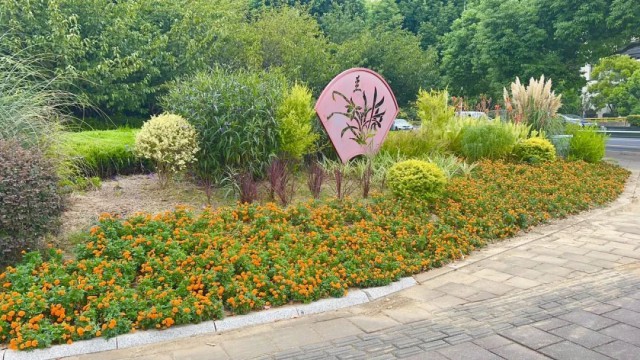 华元路与齐门北大街东南角,通过种植大量观花、色叶植物,打造色彩缤纷、错落有致的植物组团,迷迭香等香味植物从嗅觉方面丰富了花境景观的体验感,为道路增添了自然野趣。