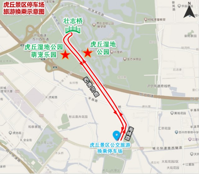 循环线路(运行时间8:00-17:00):虎丘景区旅游换乘停车场-海峰路-西塘河路-虎丘湿地公园萌宠乐园-虎丘湿地公园壮志桥-西塘河路-海峰路-虎丘景区旅游换乘停车场。