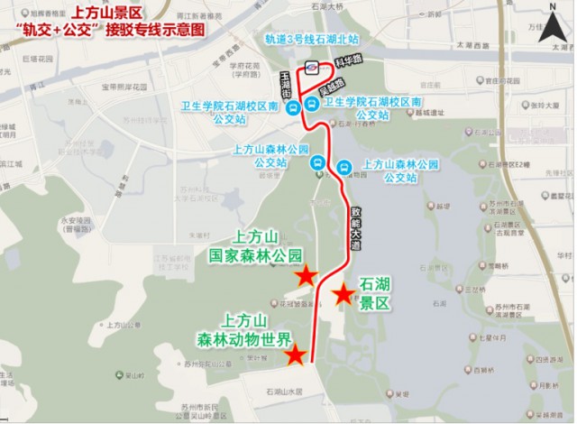 循环线路(9月29日至10月2号运行时间8:00-22:00、10月3日至10月6日运行时间8:30-18:00):轨道3号线石湖北站-科华路-玉湖街-上方山国家森林公园-致能大道-上方山森林动物世界-致能大道-上方山国家森林公园-玉湖街-吴越路-科华路-轨道3号线石湖北站。