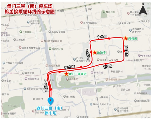 盘门三景(南)停车场旅游换乘循环线路示意图