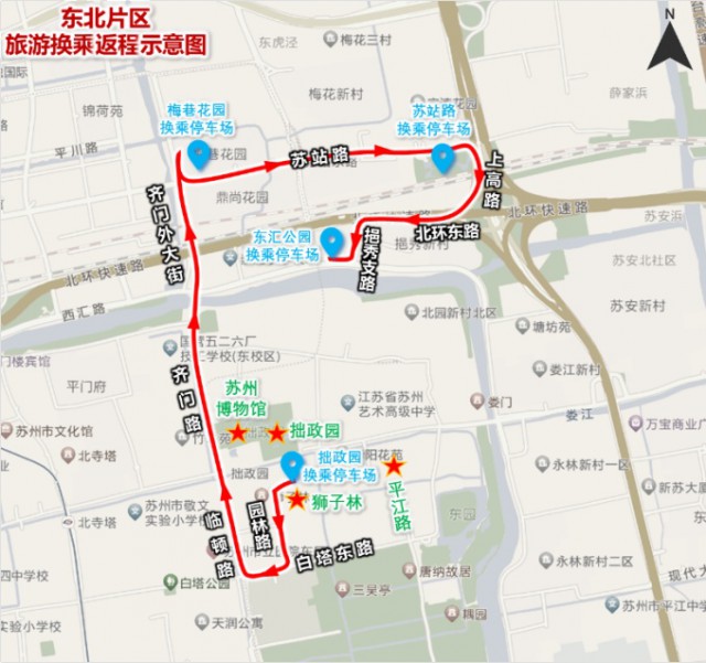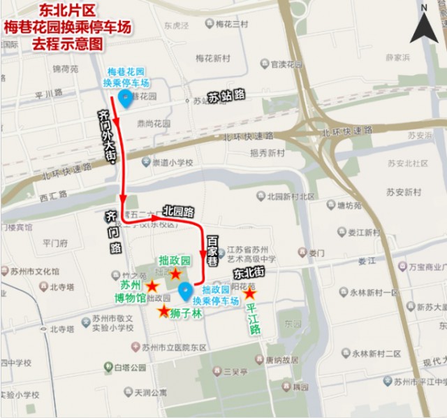 直达线路(运行时间8:30-17:00):苏站路换乘停车场-苏站路-上高路-北环东路-齐门路-北园路-百家巷-东北街-拙政园换乘停车场。