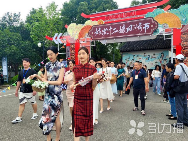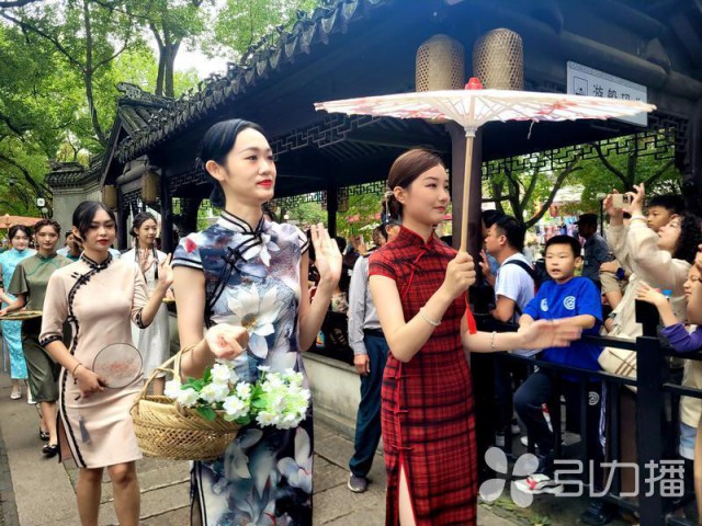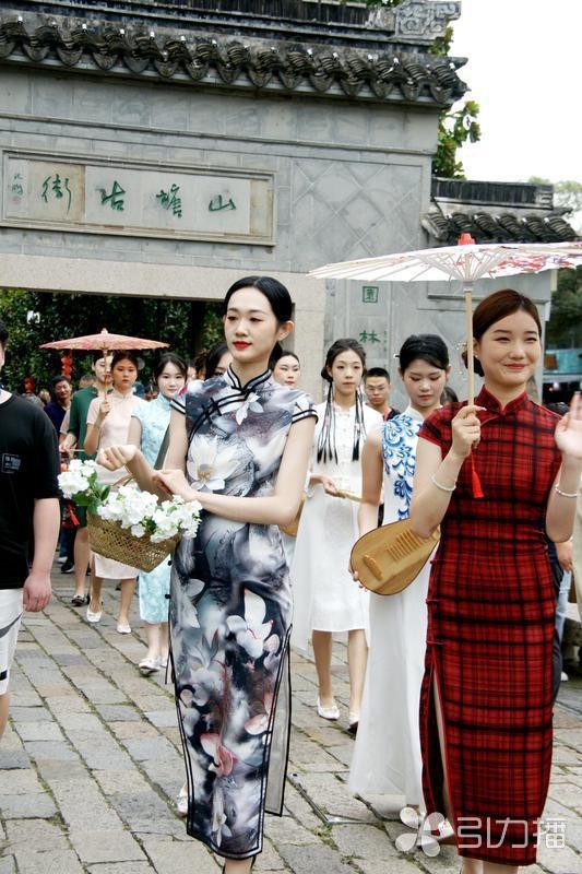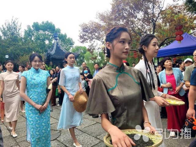 10月3日,吴中区木渎古镇,身穿旗袍的“姑苏十二娘”邂逅古镇山塘街上,花一样的十二位江南风情女子,向游客互动演绎出了吴文化中最为精彩绝伦的部分,体现了江南水乡特有的吴文化风情。(钱国强/摄 视觉苏州供图)