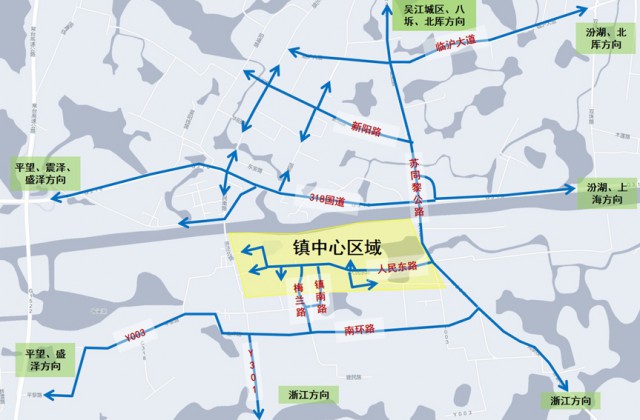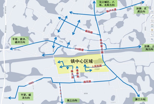 ②镇中心区域原跨河通行机动车,非高峰期建议从人民东路、梅兰路、南环路、苏同黎公路等道路绕行。