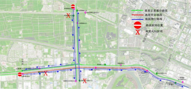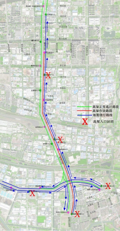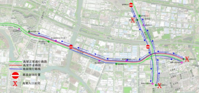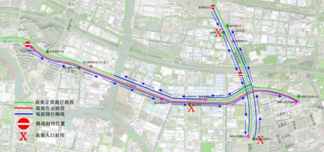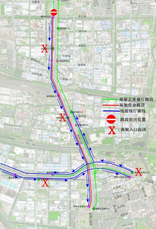 作业计划:中环东线西半幅南河路出口主车道封闭,所有车辆从南河路下匝道驶出,同时中环东线西半幅昆嘉路入口、中环东线西半幅金阳路入口、中环南线北半幅陆家立交东入口、中环南线南半幅郁金香路入口封闭。