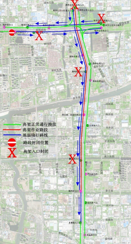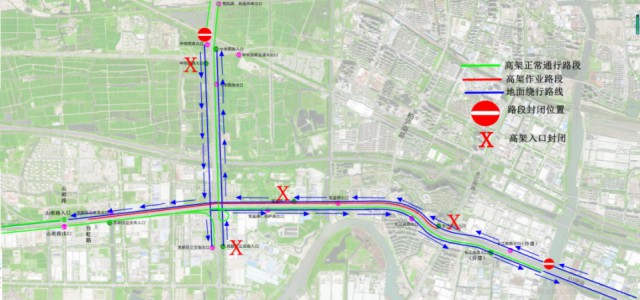 ①中环北线东往西的车辆因周市立交东主线入口封闭无法上高架,由翠薇路、黄浦江路绕行至青阳北路入口、昆嘉路入口上高架。