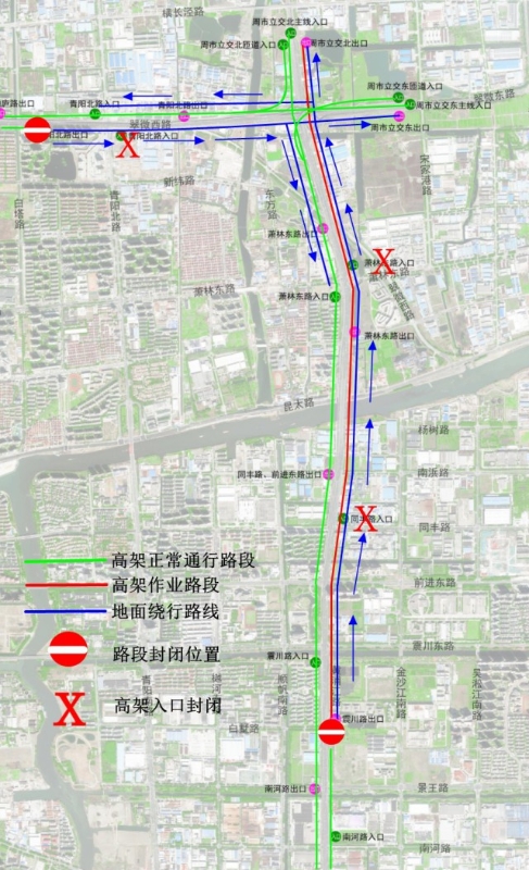 作业计划:中环东线东半幅震川路出口、中环北线南半幅青阳北路出口主车道封闭,所有车辆从震川路下匝道、青阳北路下匝道驶出,同时中环东线东半幅同丰路入口、中环东线东半幅萧林路入口、中环北线南半幅青阳北路入口封闭。