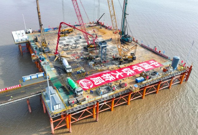 10月22日16时18分,在世界三大强潮海湾之一的杭州湾海平面上,随着最后一车混凝土灌注入杭州湾跨海铁路桥北航道桥8号主塔6号桩孔,标志着世界最长跨海高速铁路桥——南通至宁波高铁杭州湾跨海铁路桥,首个主塔墩桩基施工完成,大桥建设取得阶段性进展。