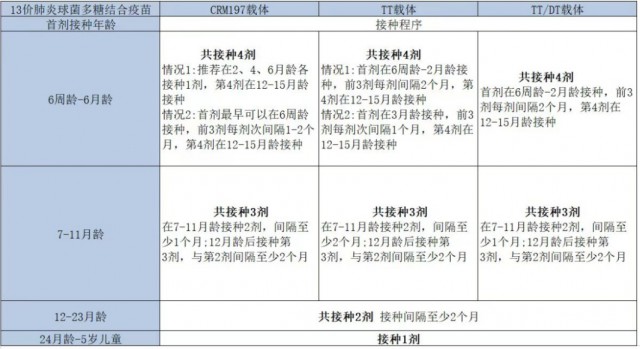 国内目前上市的PCV13有三种,均适用于6周龄~5周岁(6周岁生日前)的婴幼儿和儿童。具体接种程序如下: