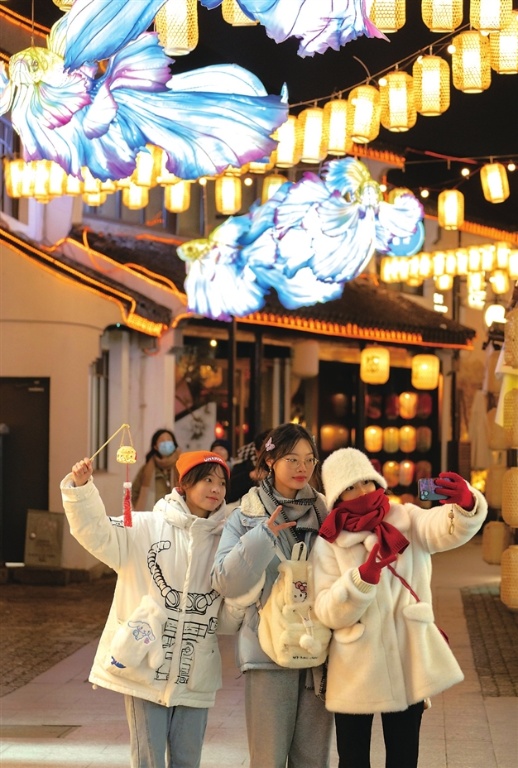 昨日(12月23日),一组炫彩缤纷的大鱼彩灯在山塘街点亮,梦幻的大鱼造型,展现了古人“一夜鱼龙舞”的浪漫,吸引了许多本地市民和外地游客前来赏灯。