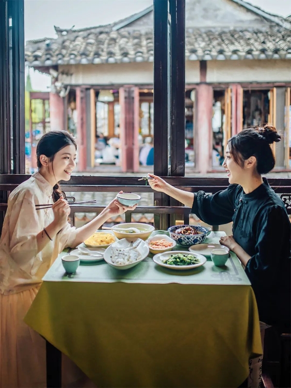 周庄的街巷里还藏着许多美食。万三捞卤或是鑫震源里飘来阵阵香气,馄饨、生煎、烧麦……在满满烟火气里拉开一天的序幕。或也可以闲坐沈厅酒家二楼,看窗外流水人间,品桌上美食真味。