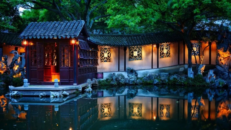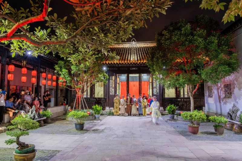 夜晚在木渎古镇,苏州首部沉浸式园林实景话剧——《遇见姑苏.木渎往事》在严家花园上演。百年风云,际会木渎。随着剧情推演,共赴庭院深处,入境、入景、入情、入心。