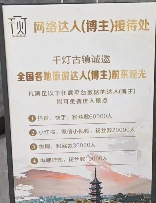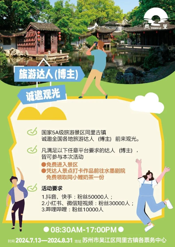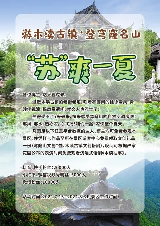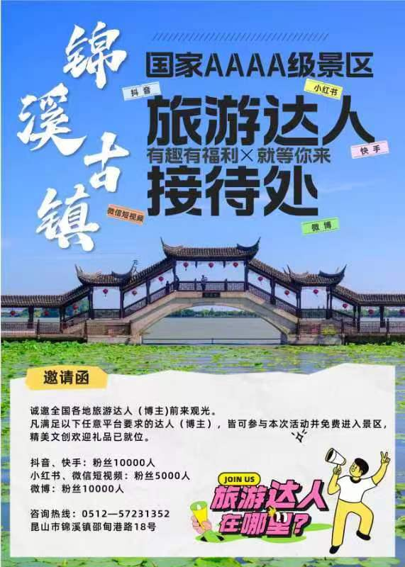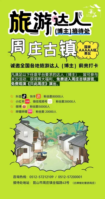 即日起凡满足任意平台粉丝数据要求的达人(博主),皆可参与本次活动,免费游览周庄古镇,免费观演《只此周庄》。