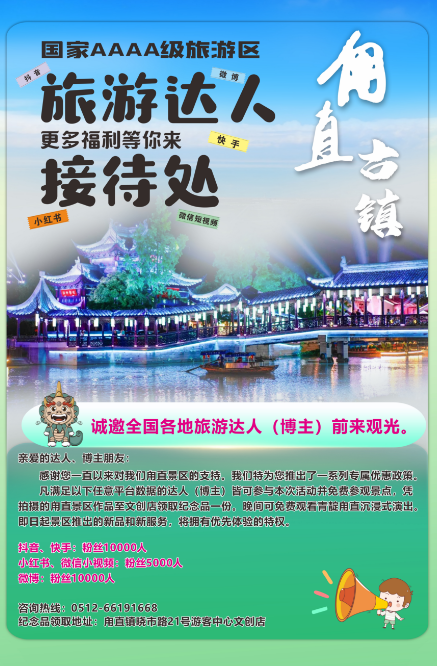 满足平台数据要求的达人(博主)到访周庄古镇,可免费观看 行浸式多维空间剧《只此周庄》;到访 甪直古镇,可免费体验 沉浸式演出 《锦夜· 青靛甪直 》;到访木渎古镇,可免费观看 园林沉浸式话剧《遇见姑苏.木渎往事》 。