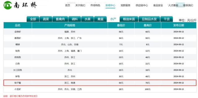 从南环桥官网上可以查询到,8月12日梭子蟹的售价在50元/公斤-70元/公斤之间。