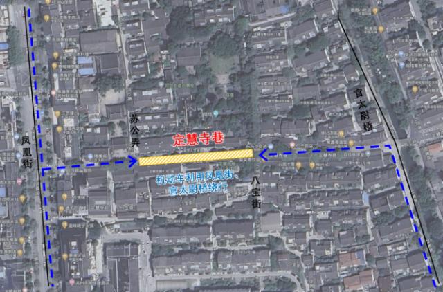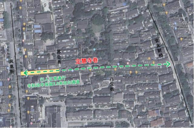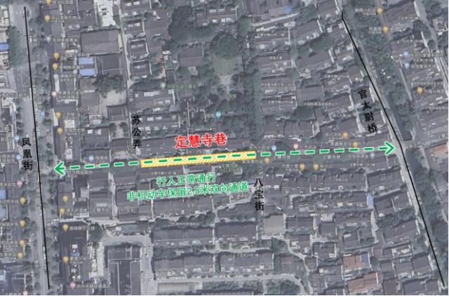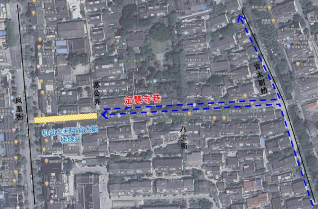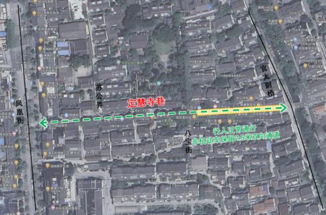 交通组织:分南北两半幅施工,施工期间保留半幅路面保障非机动车、行人双向通行,机动车需经凤凰街、官太尉桥绕行至定慧寺巷两侧进出。