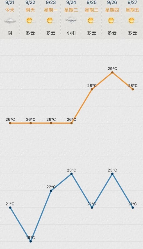 受这股冷空气的影响,双休日两天气温将明显下降,其中周六最低气温在23~24℃,最高气温在27℃左右,周日最低气温在20℃左右,最高气温在25℃左右。